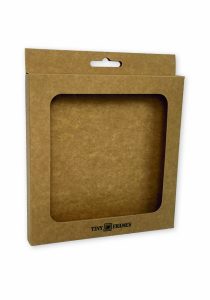 Doosje met rond venster en 2 klepjes 85x225x14 mm, van kraft karton gemaakt. Ook met wit karton te leveren.
