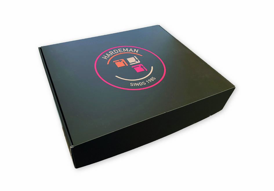 Schuifdoos met dikke wand, binnenmaat 360x250x100 mm. Bodem is van golfkarton, sleeve is van vouwkarton. Kan ook van wit karton gemaakt worden met bijvoorbeeld full color opdruk.